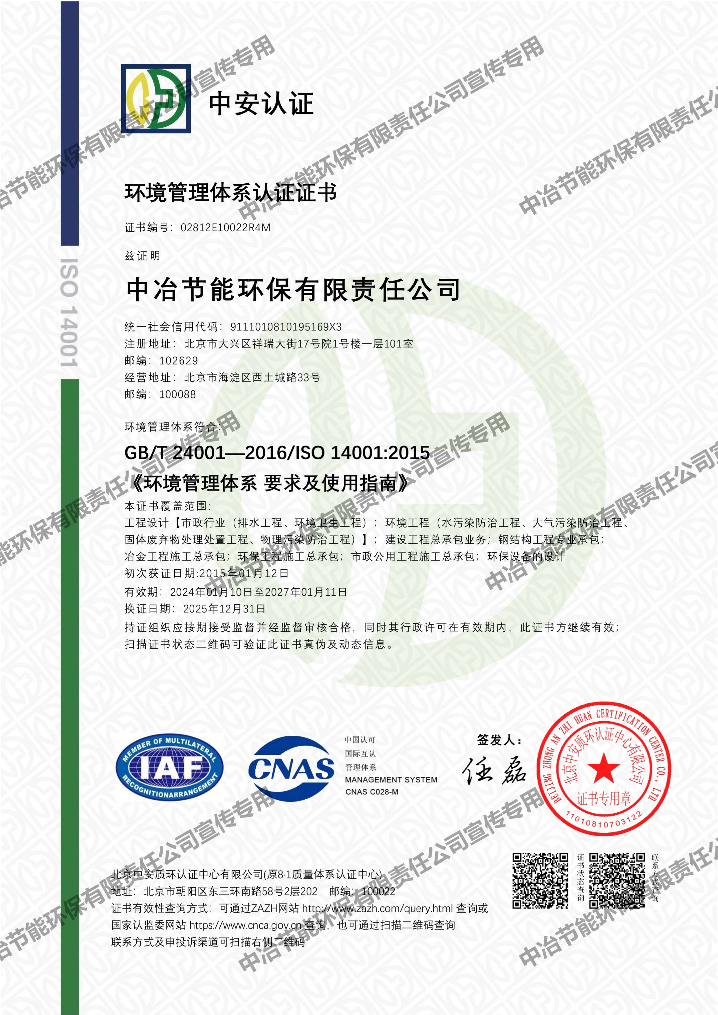 环境管理体系认证证书